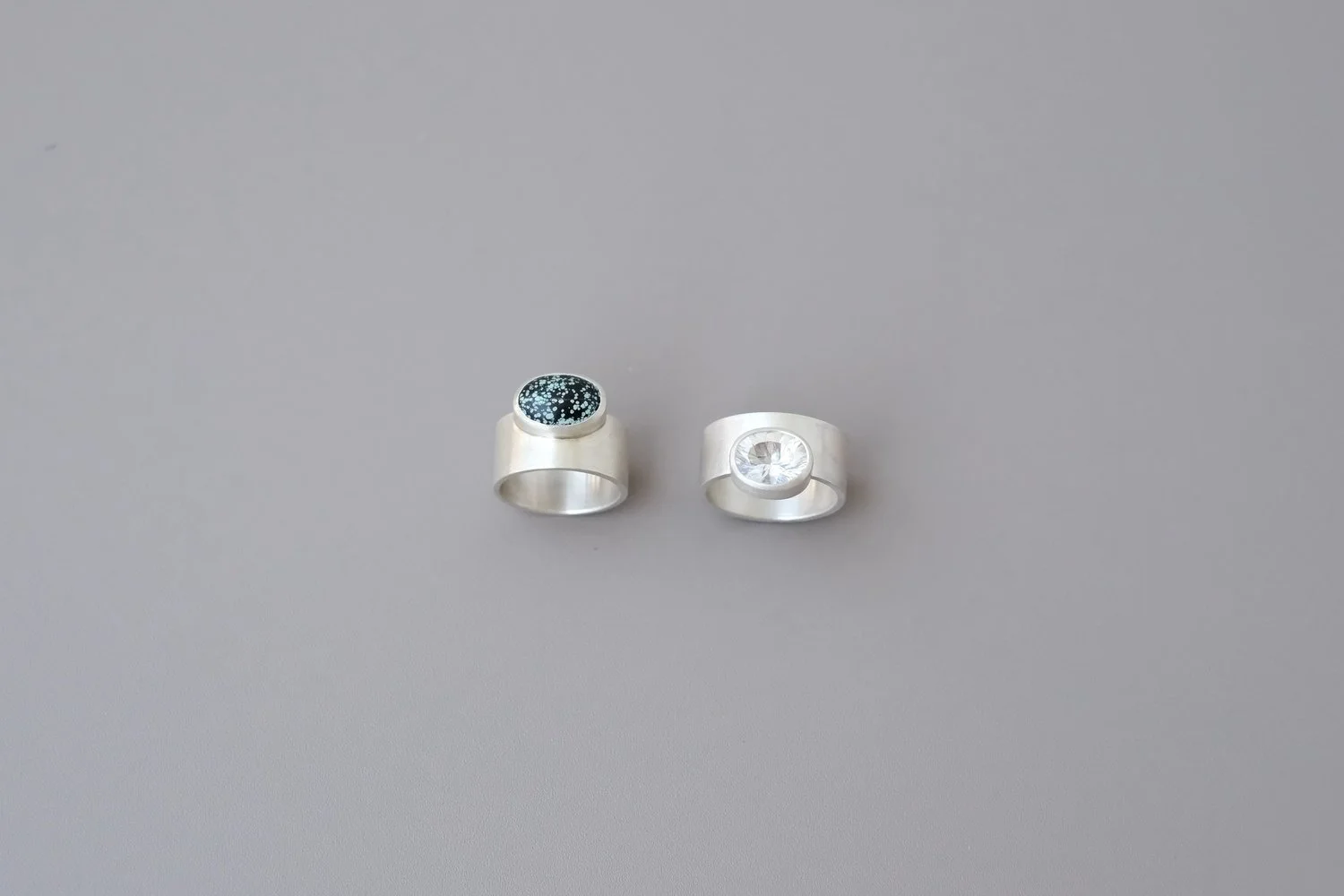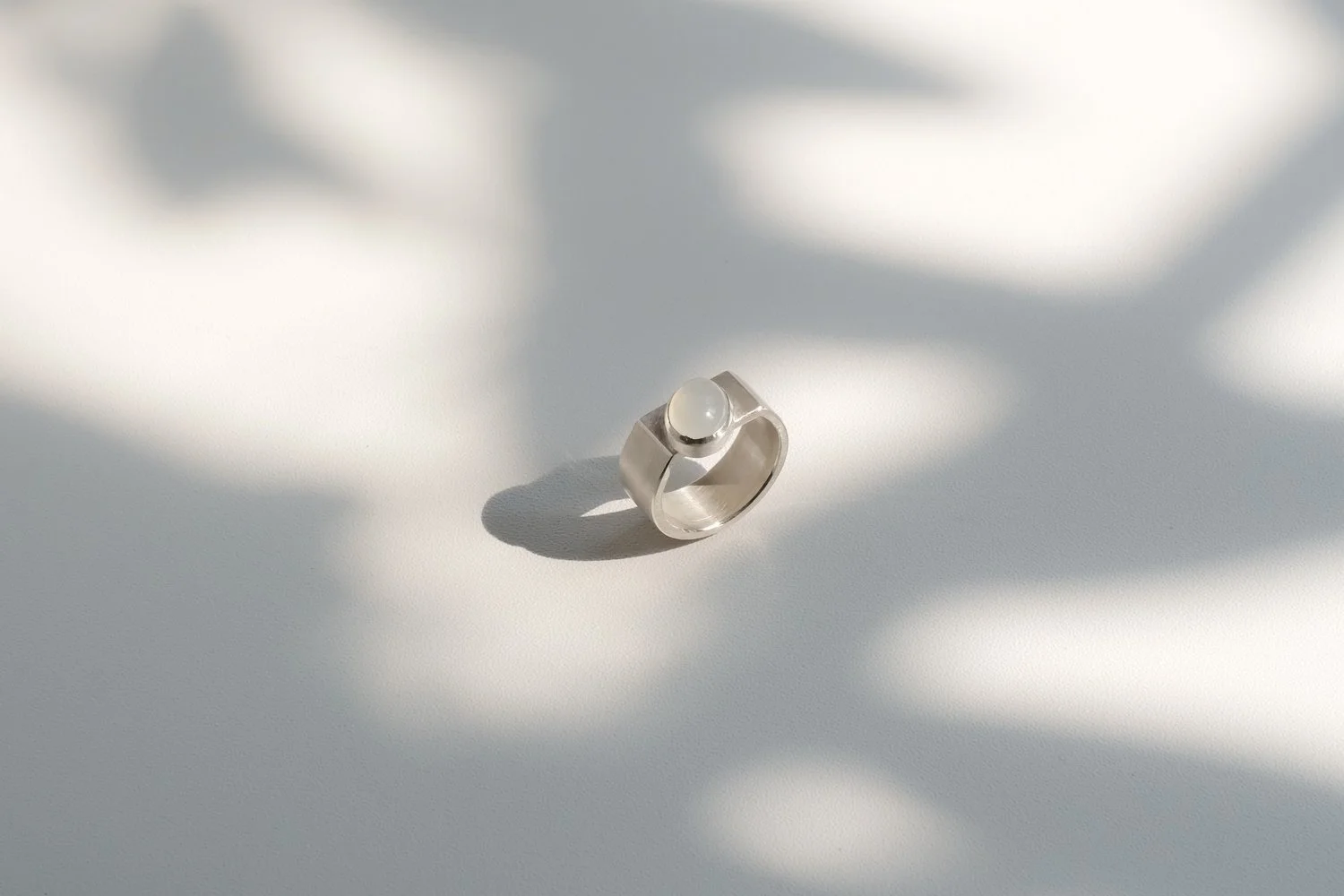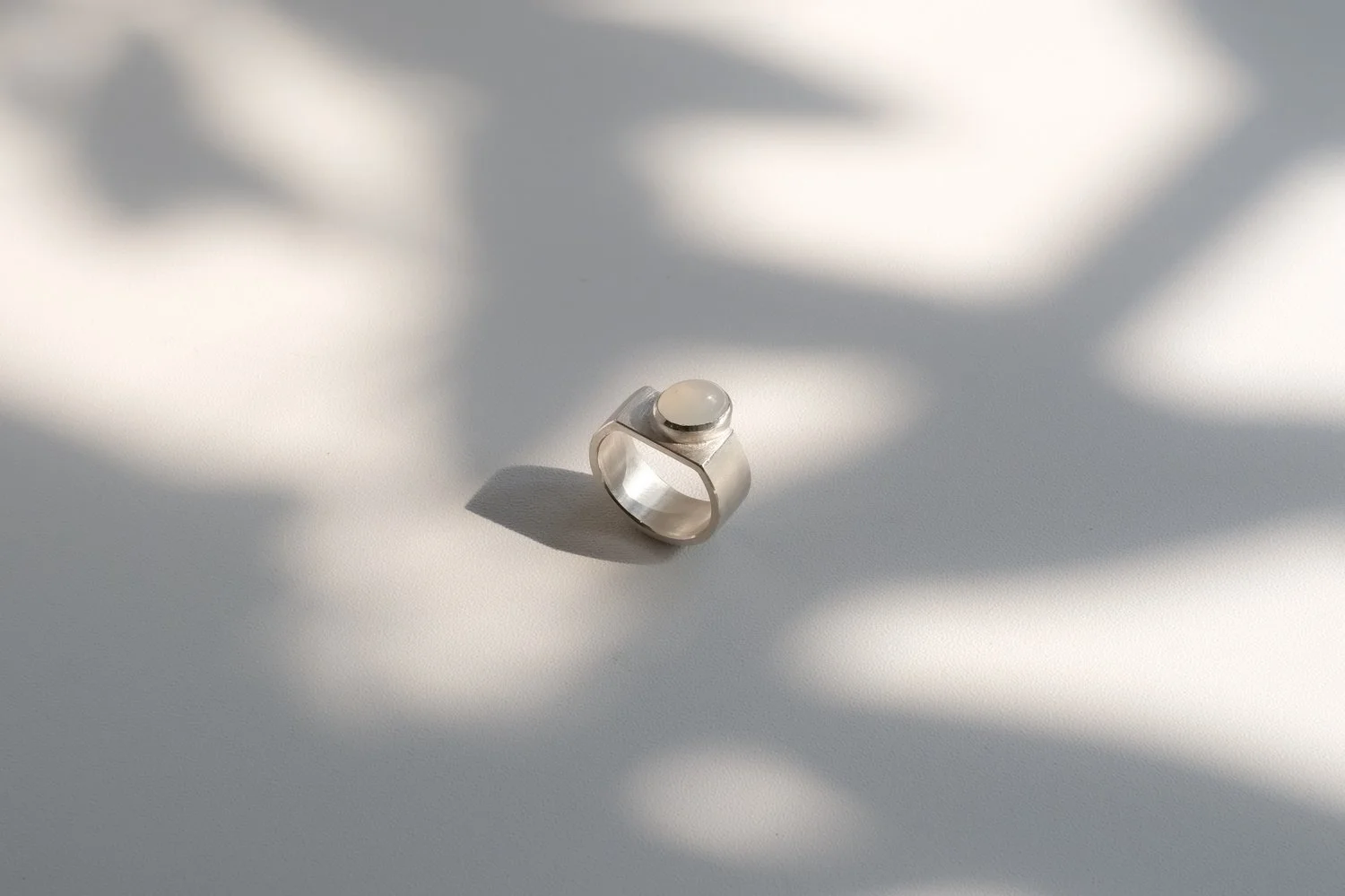 Flat silver sheet is transformed into a domed, three-dimensional ring through hammering and forming techniques. The result appears bold and substantial, yet remains light and comfortable — offering both structural integrity and wearability.