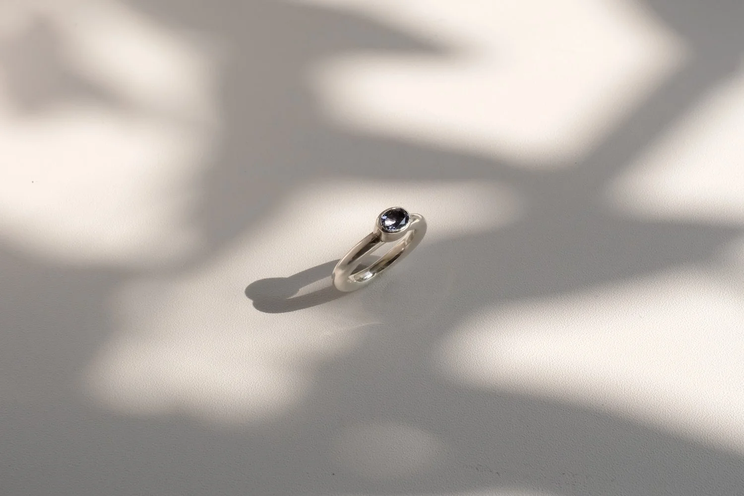 將平面的銀片經錘打與成形技巧,轉化為半拱狀的立體戒身。看起來厚實有份量卻保持輕盈,兼具結構感與舒適度